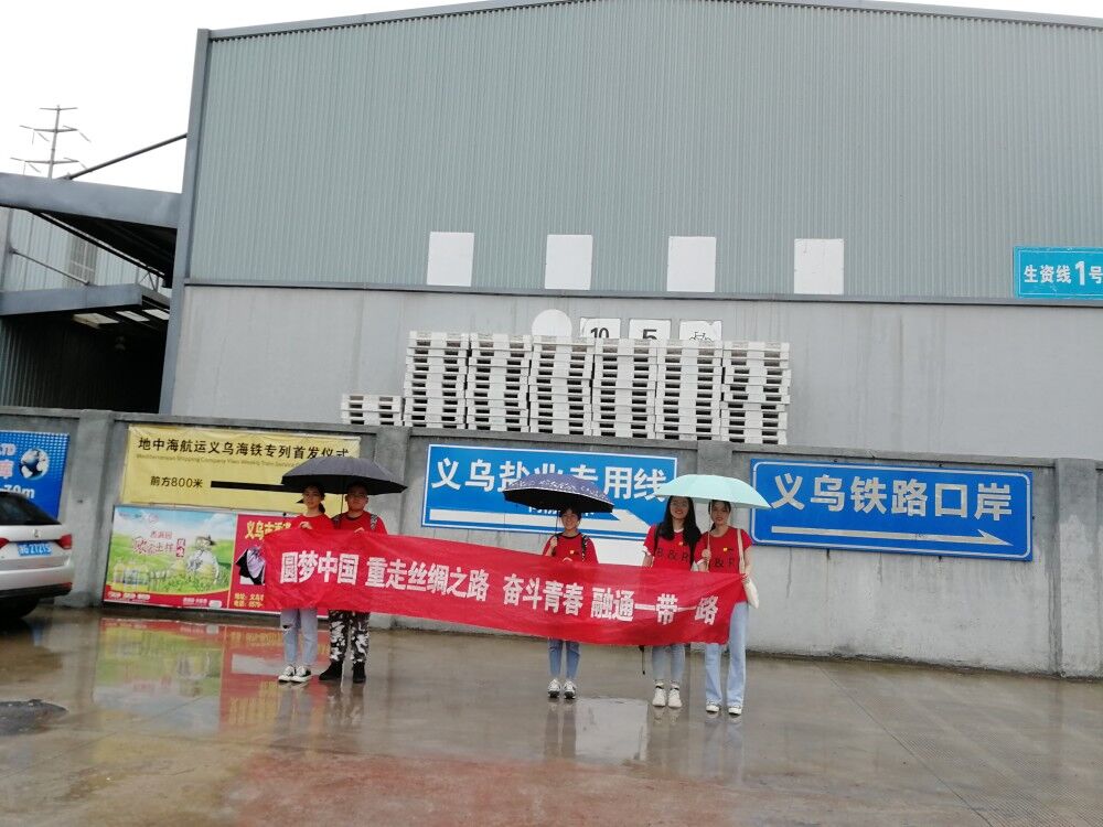 伴着淅淅沥沥的雨,“圆梦中国 丝路新世界”暑期社会实践团队来到了义乌铁路口岸,在雨中参观这国际贸易改革的开发窗口。沿着大大小小的仓库一路走去,不禁为口岸的强大功能所震撼。它以“义新欧”中欧班列为纽带,开辟出了一条沟通境内外、连接东中西的陆海运输通道。