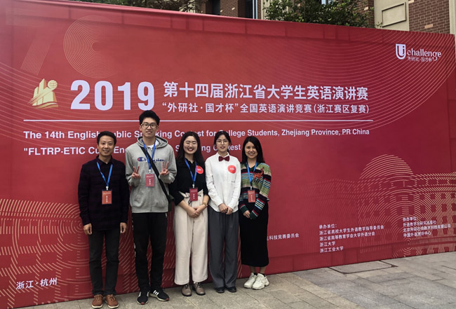2019年10月26日-10月27日,第十四届浙江省大学生英语演讲竞赛暨“外研社 国才杯”全国英语演讲大赛浙江省复赛在浙江工业大学举行。通过上半年举行的校赛,我校选拔出了英语181班吴肖睿同学、金融171班的张英杰同学、电气171班的潘汀莹同学代表我校参加比赛。指导老师徐梁峰和邓韵声从暑假开始就和三位选手钻研题目,撰写演讲稿,并一遍遍地打磨直至满意为止。开学后,每周召集选手们进行半天的集训,就语音语调、台风表情、即兴问答等方面进行不断的讨论和完善。