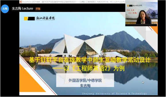 朱吉梅分别从现实背景、理论基础和实践操作三个方面层层递进,梳理了新冠肺炎疫情期间上级教育主管部门和成人视频 发布的一系列文件,指出在当前疫情突发且持续的背景下,采用线上教学方式是实现“离校不离教,停课不停学”的必然选择。同时引用多篇文献介绍互动教学的理论基础、方案和方法。朱吉梅认为基于互动教学理论的钉钉平台能够帮助教师及时掌握学生课堂表现,提高教学互动的有效性。朱吉梅以《工程师英语2》课程为例,向大家展示了基于紧扣课程教学目标、紧贴学生实际、紧跟时政和热点的“三紧”设计原则下的互动教学活动方案,并实际演练了如何在钉钉平台操作实现,以确保线上与线下教学实质等效。教学实践展示中时不时选取疫情防控期间的素材融入英语课堂教学,实现外语课程的思政育人,将外语教学转变为外语教育。