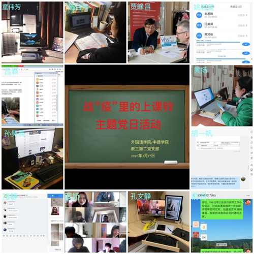 此外,大外二支部结合单元主题医疗体系,进行了中美医疗体系的介绍与对比,让同学更为直观地讨论与感受疫情防控时期我国能够快速控制疫情蔓延的背后原因,锻炼学生批判性思维能力。法语支部适时地向学生介绍法国新冠肺炎疫情的出现和发展,让学生有机会了解一些必要的时政信息。通过介绍法国的疫情应对,引导学生认识和领会新时代中国特色社会主义的优越性。行政支部努力围绕服务师生开展工作。教务员居家线上解决相关教务问题,办公室为保障线上教学顺利开展,积极购买线上教学所需设施设备,组织开展好线上面试,做好人才引进工作。辅导员居家办公,关注学生对于线上教学的适应情况,关注学生健康打卡,关心关爱特殊群体学生心理稳定情况。疫情防控进入下半场后,重点关注海外学生近况,逐一联系近400名留德同学,通过与同学们的交流和提醒,提醒学生做好防护。外事秘书积极组织外教线上教学,联络出国学生,保持信息畅通。