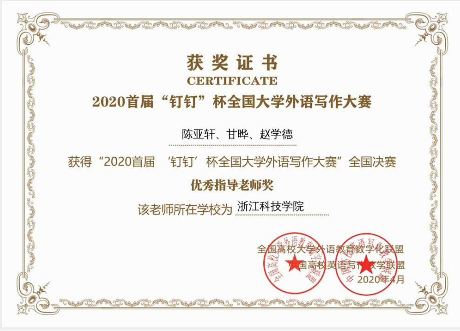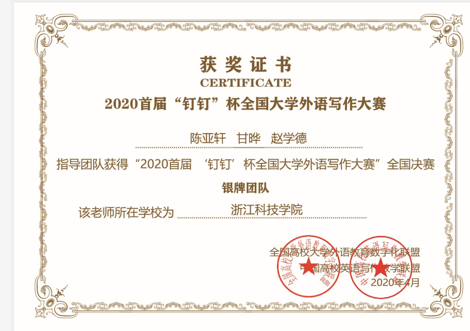 2020 年首届“钉钉”杯全国大学外语写作大赛(以下简称大赛)是由全国高校大学外语教育数字化联盟、中国高校英语写作教学联盟联合主办,全国高等学校大学外语教学研究会指导,钉钉(中国)信息技术有限公司平台支持,批改网(www.pigai.org)、西安嵩硕教育科技有限公司共同承办的覆盖全国在校大学生的线上外语写作比赛活动。2020年1月15日至2020年3月31日在钉钉平台进行了大赛初赛,成人视频 由574名学生组成的团队报名在全国近30万人、600个高校、近3000个团队中表现突出,顺利获得入围决赛资格。
