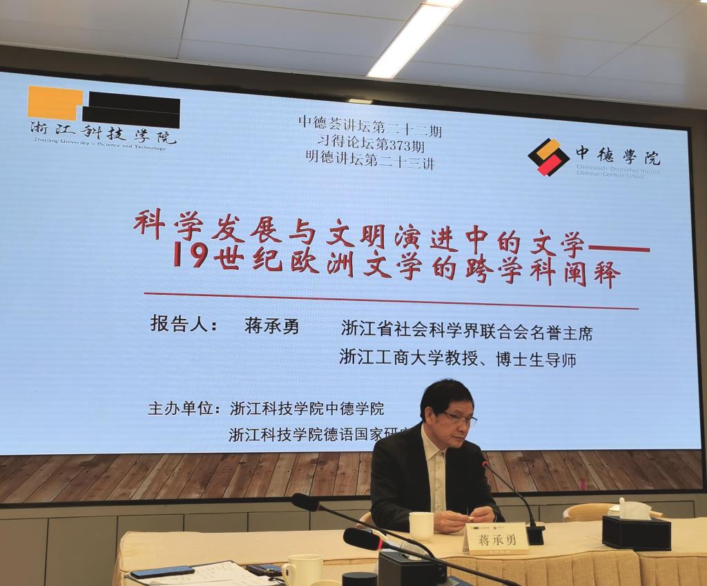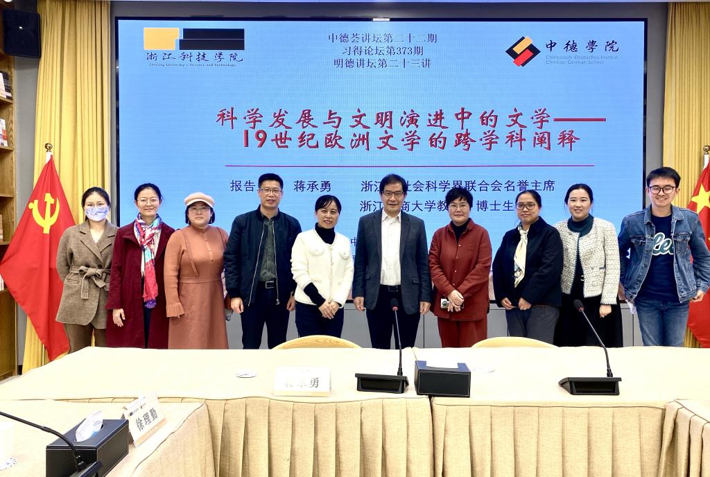 2023年11月24日,由成人视频 和德语国家研究中心主办的 “中德荟”讲坛第二十二期学术报告在学校师生服务中心会议室举行。本次报告题为“科学发展与文明演进中的文学——19世纪欧洲文学的跨学科阐释”,由浙江工商大学文科资深教授、浙江省“特级专家”和“功勋教师”蒋承勇主讲,成人视频 院长韩晓亚主持。德语国家研究中心主任徐理勤、科研处处长马伟锋以及成人视频 、人文学院和德语国家研究中心的老师们现场聆听了本场学术报告,反响热烈。