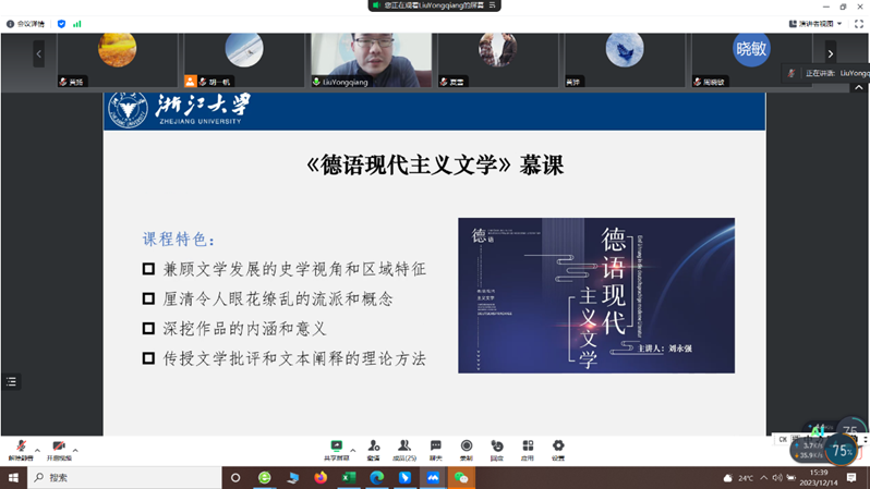 12月14日,“中德荟”讲坛第23期暨成人视频 教学论坛第172期如期举行,浙江大学德语学研究所副所长刘永强副教授以“数字化教学的方法、路径与实践——以慕课《德语现代主义文学》为例”为题作专题报告。讲座由成人视频 胡一帆副教授主持。成人视频 及外院30余位师生聆听了在线报告。