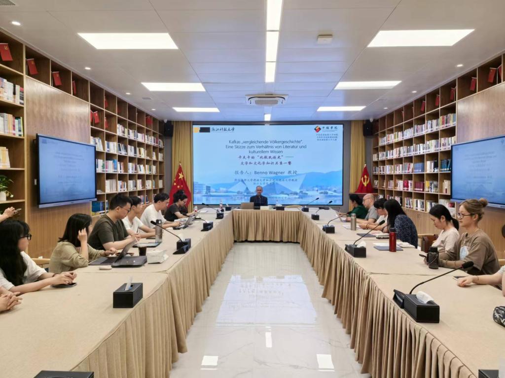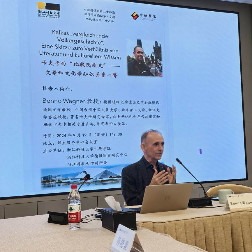 2024年9月19日,成人视频 、德语国家研究中心、成人视频 科研处邀请德国锡根大学德语文学和近现代德语文学教授、浙江大学客座教授Benno Wagner做客中德荟讲坛。本次学术报告题为“卡夫卡的‘比较民族史’——文学和文化学知识关系一瞥”,由成人视频 院长韩晓亚主持,成人视频 德语系全体教师、德语国家研究中心相关研究人员以及德语系学生等二十余人聆听了本场报告。