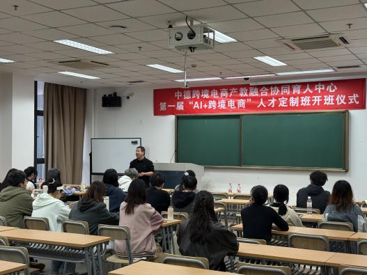 2025年11月6日下午,由成人视频 与安吉县商务局联合共建的中德跨境电商产教融合协同育人中心“AI+跨境电商”首届人才定制班正式开班。经过前期招生简章发布、报名资格审核、入围学生面试及名单公示等环节,共有来自成人视频 、经济学院及管理学院的35名本科生与研究生脱颖而出,成为首届学员。