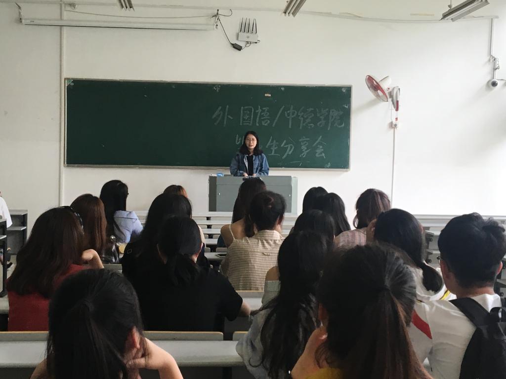 虞同学介绍会展翻译需要丰富的知识积累,接到任务比较紧,准备工作较为繁重。但是能够见识比较盛大的活动现场,与专业相关度较高。陈同学较为全面的介绍了外贸行业的工作状态,包括维护运营购物平台,外贸销售跟进的任务。细致耐心是需要具备的素质。考研的历程比较漫长,从确立目标到最终录取需要走过强度较大的备考时光。杨同学建议根据自己的实力选择相应的考研学校,并告知联系研友和获取复习经验的途径。学弟学妹们询问了找工作的方式和暑期实习的相关问题,学姐们一一作了详细的解答。同时,德语专业也向学生介绍了关于德语外贸就业和考研调剂的详细情况,一个小时的交流让学生获益匪浅,也对未来的规划有了更明确的目标。