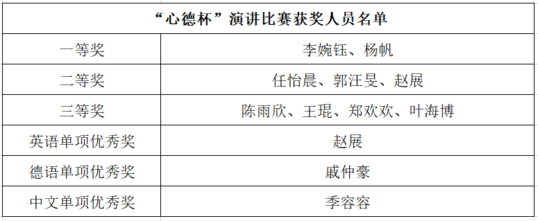 经过精彩激烈的比赛和公平公正的评审环节后,由各位领导和老师为优秀的获奖选手颁发奖状、给予美好的期望并合影留念。相信本次“心德杯”演讲比赛不仅给同学们搭建了展现自我的平台,更激励着大家朝着国际文化传播人才的方向迈进,在文化碰撞的激流中握牢手中的船桨,荡起美丽的浪花,向全球讲出中国故事,讲好中国故事。