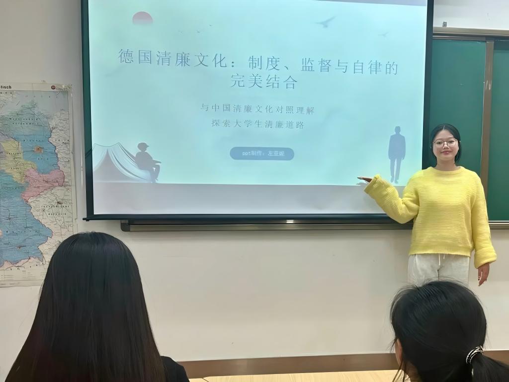 廉洁主题诗歌往往蕴涵着深刻的道德观念,如诚实、正直、公正等。社团成员们通过朗读德语廉洁主题诗歌,将廉洁文化以诗歌这一艺术形式为载体,跨越国界,提高同学们对德国廉洁文化文化的认识与理解,激发社员对廉洁行为的向往和追求。