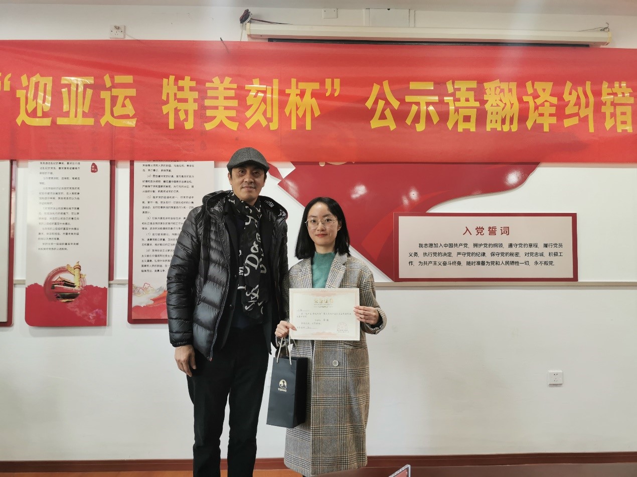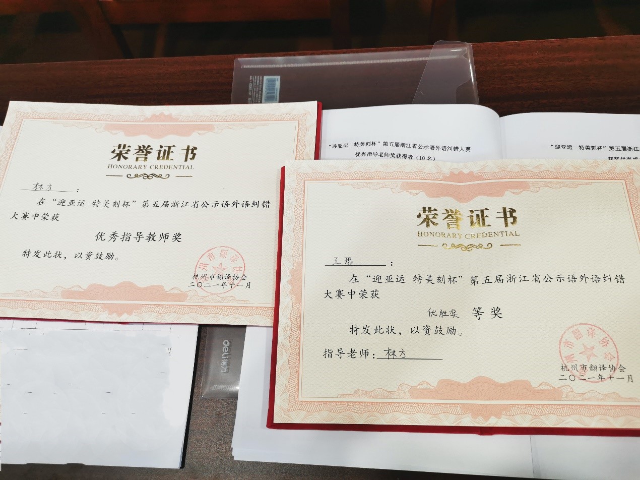 2021年12月4日,“迎亚运 特美刻杯”第五届浙江省公示语外语纠错大赛颁奖典礼暨杭州市翻译协会四届二次理事会于杭州科技职业技术学院隆重举行。我院德语专业系主任林方老师与德语201班王琨同学应邀出席。此次大赛中,我院林方老师获“优秀指导教师奖”,王琨同学获“优胜奖”。