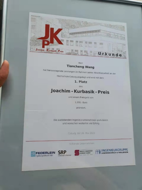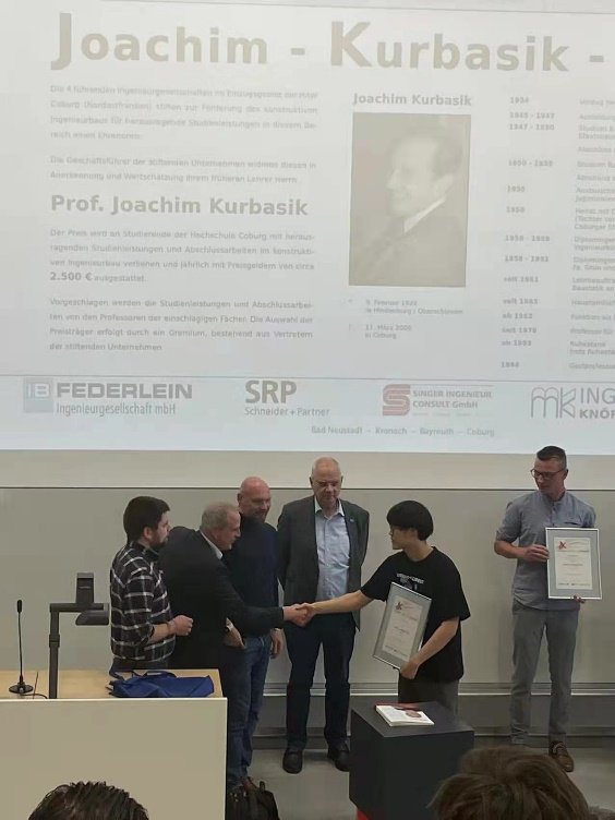 2022年5月26日,在德国科堡应用科技大学的JOACHIM-KURBASIK-PREIS奖学金评选中,我院2+3土木专业16级学生王天成获得了一等奖学金。这也是这个奖项自2014年创办以来首次颁发给外籍留学生。