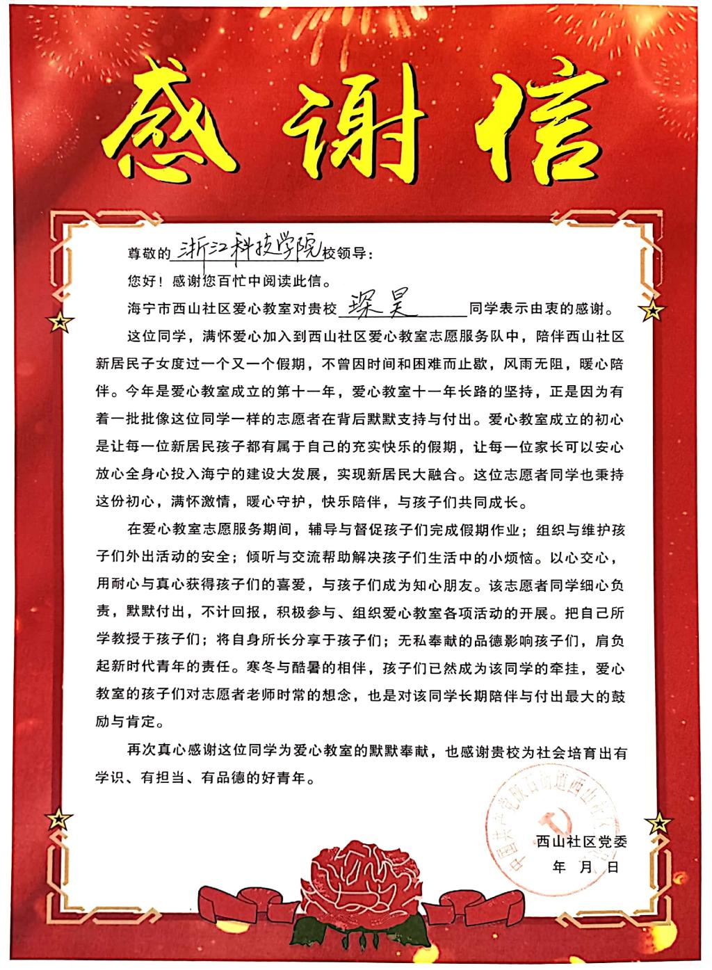 近日,海宁市西山社区爱心教室就我院琛昊同学的志愿工作寄来了感谢信,表示由衷的感谢。信中表示:琛昊同学怀揣着自己的一份爱心加入到西山社区爱心教室志愿服务队中,陪伴社区新居民子女度过假期、辅导并督促孩子们完成假期作业、组织和维护孩子们外出活动的安全并倾听解决孩子们的烦恼,同时将其所学传授给孩子们,将自身所长分享于孩子们。在此志愿服务期间,琛昊同学保持激情、细心负责、不求回报,既推动了爱心教室的持续...