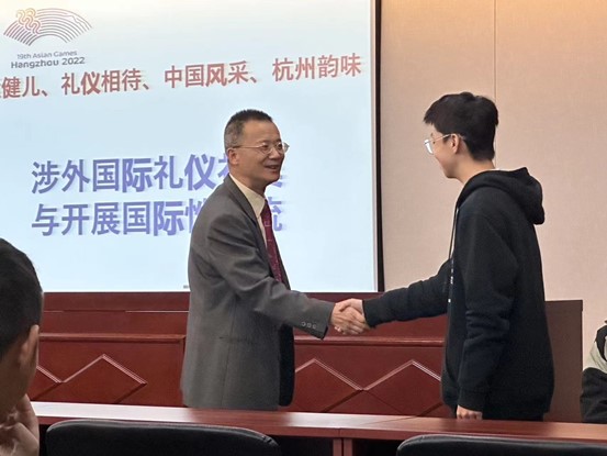 为科普外交礼仪,让学生深入了解国际知识,我院于2023年11月10日下午开展主题为《涉外国际礼仪礼宾与开展国际性交流》的讲座,讲座邀请了省外办王敏处长进行演讲,学院老师和中德联合培养本科生项目学生于图书馆报告厅参加讲座。 王处长详细讲解了外交礼仪,穿着打扮以及坐姿站位的相关注意事项,他强调“服装是为了不让你被拒之门外”,这让同学们更深刻的了解了服装对于一个人的形象的重要性,王处长还随机抽取了几名同学进行...
